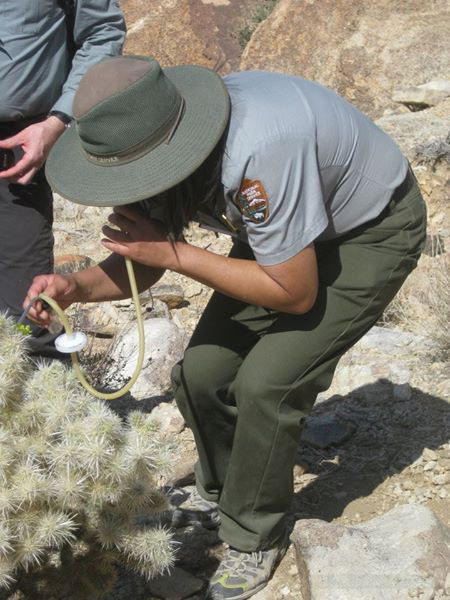 Joshua Tree NP biologist collecting insects from a cholla cactus with an aspirator
